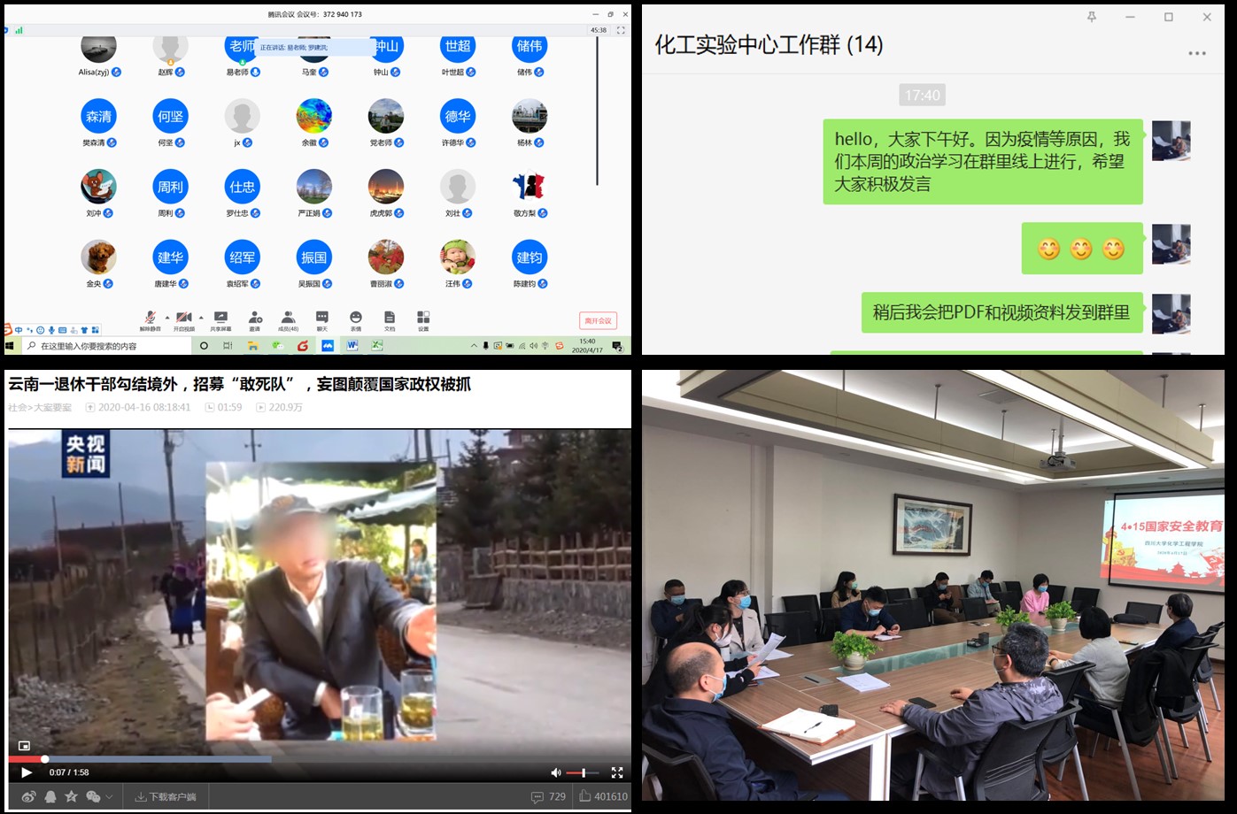 多个党支部也开展了线上支部活动。通过党支部云学习,大家认识到了公民保守国家安全的重要性和必要性,强化了维护国家安全和社会稳定的意识。并结合《国家安全法》、《反间谍法》、《网络安全法》、《中华人民共和国国家情报法》、《中华人民共和国境外非政府组织境内活动管理法》中部分内容的学习,针对高校师生可能接触及重点注意的地方进行了讨论。