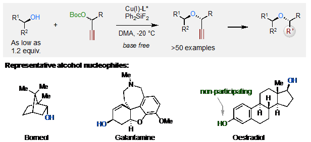 钮大文教授课题组尝试利用Cu催化反应突破以上难题。他们通过对反应机理的深入研究,发现造成亲电试剂分解的主要原因可能是碱的使用。以此为突破口,他们尝试从反应条件中移除碱。通过实验研究,最终发现碱的移除果然大大降低了亲电试剂的分解速度。此后,团队进一步通过调整反应的其它要素,首次成功实现了对二级脂肪醇的不对称炔丙基化反应。该反应条件十分温和,并且具有很好的普适性。所得产物也可以快速转化成各种手性醚,可能作为药物化学研究的重要中间体。