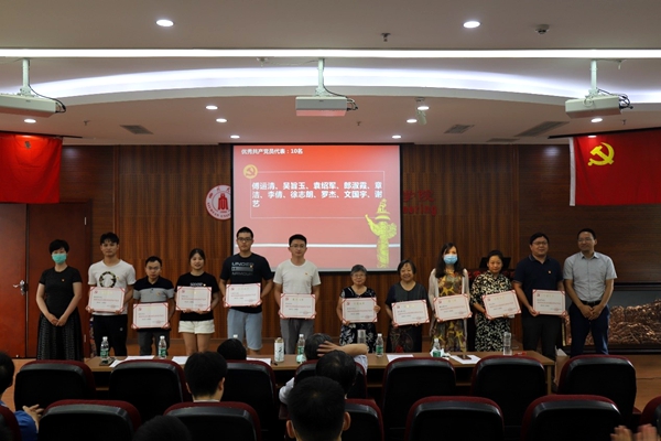 党委委员、工会主席穆畅道和专职组织员陈晓东为获得优秀党务工作者称号的同志颁奖。