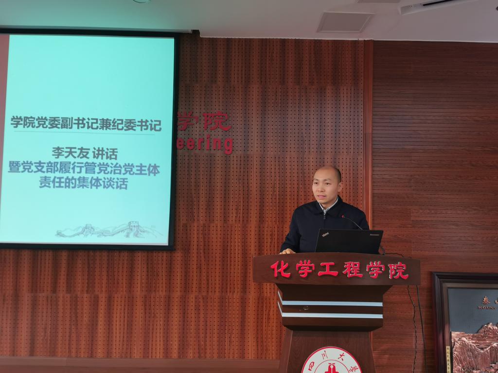 党委副书记兼纪委书记对参会委员们进行了党支部履行管党治党主体责任的集体谈话。他说到,全体支部委员要对照《四川大学党支部标准化规范化建设工作清单》,严格遵循《中国共产党支部工作条例(试行)》中明确的5条原则和8条任务,加强思想政治引领,筑牢学生理想信念根基,落实立德树人根本任务,保证教学科研管理各项任务完成。各党支部要树牢“四个意识”、坚定“四个自信”、做到“两个维护”,切实把抓好党支部标准化规范化建设,扛牢管党治党的组织责任,打通基层党建“最后一公里”。党支部纪检委员要明确工作职责,发挥纪检作用,推进全面从严治党向纵深发展。