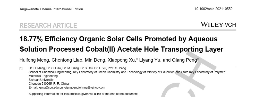 彭强教授课题组在Angew. Chem. Int. Ed.上发表题为“18.77% Efficiency Organic Solar Cells Promoted by Aqueous Solution Processed Cobalt(II) Acetate Hole Transporting Layer”的研究论文。该课题组开发了一种基于醋酸钴的新型空穴传输层材料及其水溶液绿色制备工艺,将有机太阳能电池二元器件的能量转换效率提高到目前最高的纪录18.77%。8bo足球即时比分