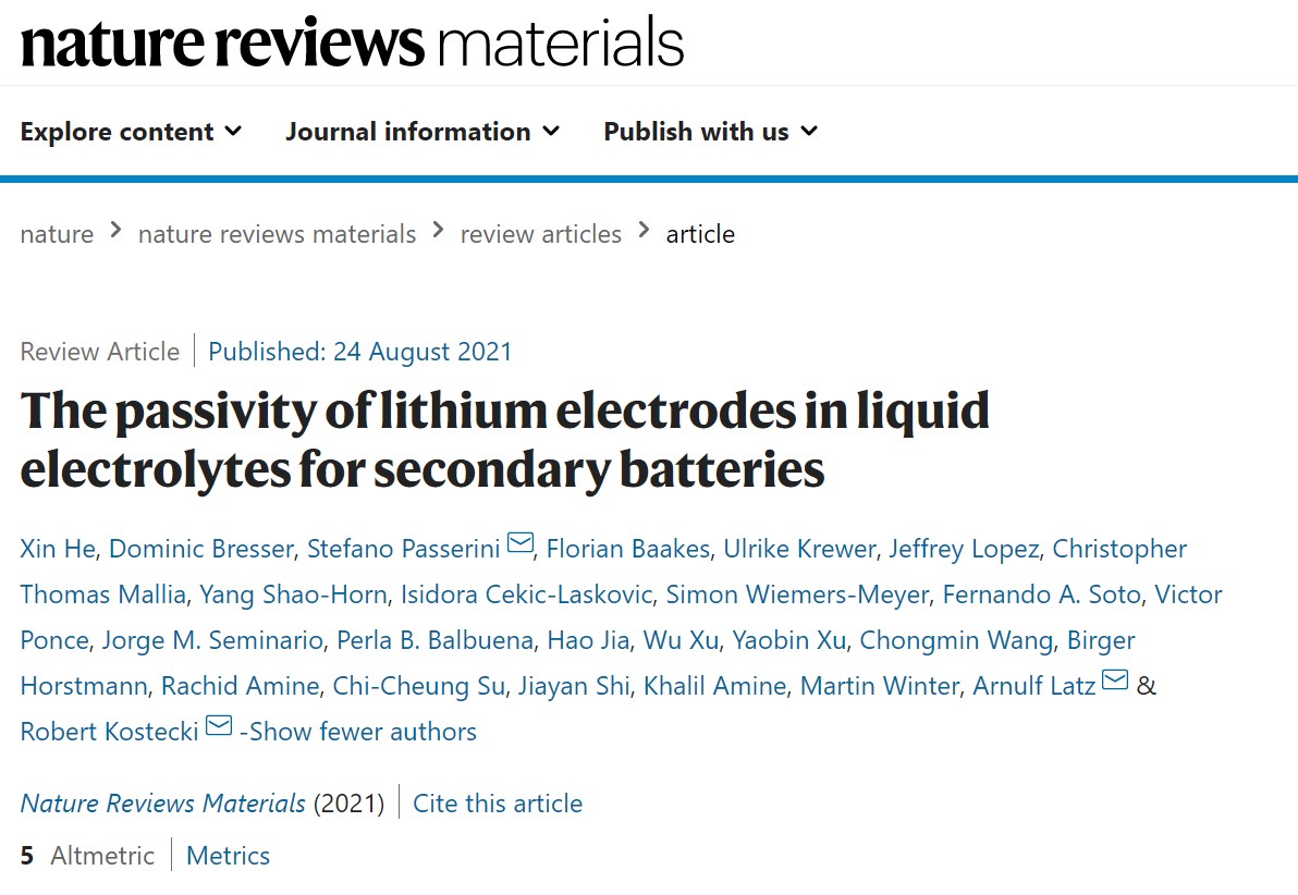 何欣特聘研究员在Nature Reviews Materials发表了题为“The passivity of lithium electrodes in liquid electrolytes for secondary batteries”的研究论文。该文章从一个稍微不同的角度对发生在锂电极-液态电解质界面的反应进行了深入研究,参考了金属上腐蚀和钝化现象的一般概念,并重新审查了相应的、成熟的电化学理论和模型。