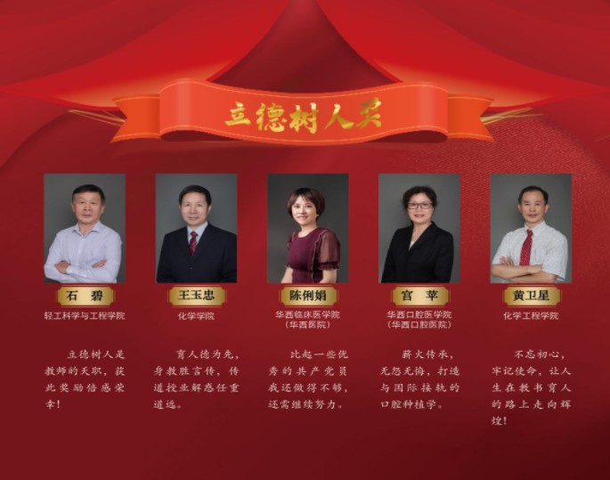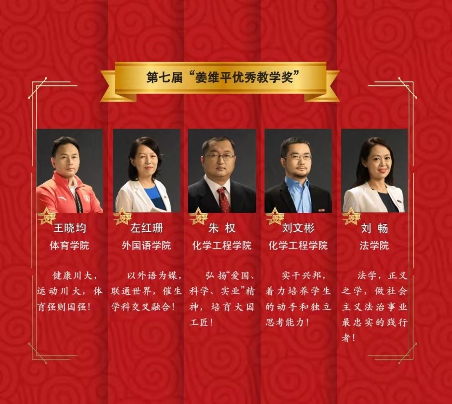 黄卫星教授获得第八届“卓越教学奖”和2021年四川大学“立德树人奖”,朱权教授和刘文彬副教授获得第七届“姜维平优秀教学奖”二等奖,李晓燕老师获得校2021年先进个人。