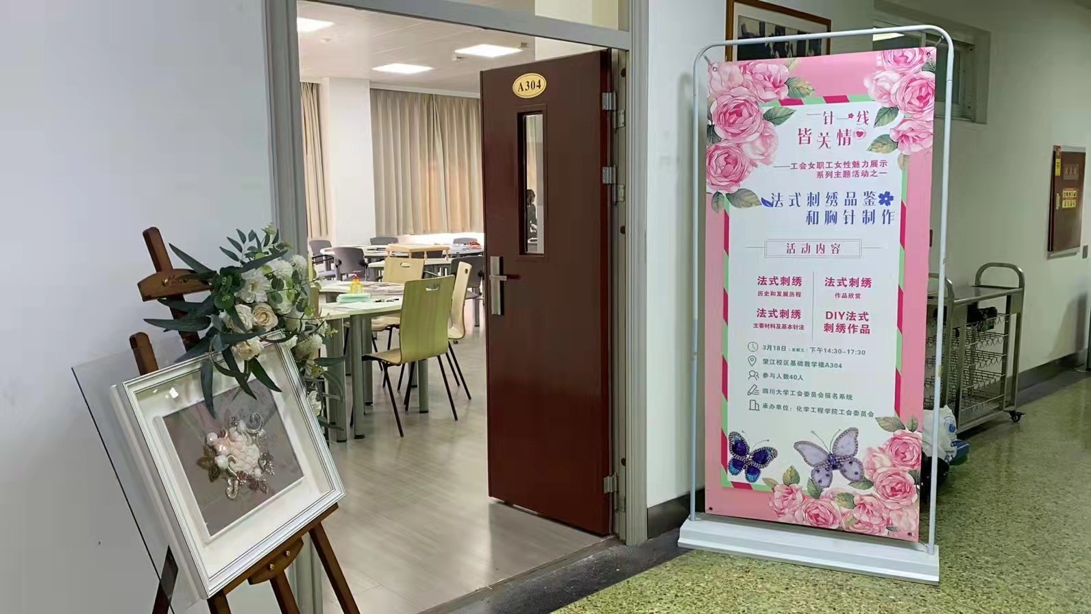 工会承办的“一针一线皆关情”工会女职工女性魅力展示系列主题活动之法式刺绣品鉴和胸针制作活动于3月18日下午在基础教学楼A304顺利举办,活动吸引了来自校内多个单位40余位女职工的热情参与。校工会王蕾老师、杨秀建老师也来到活动现场,全程组织参与。