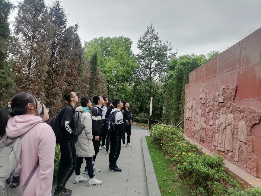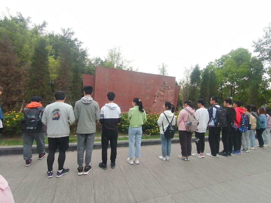 随后,全体同学一同前往江安英烈碑进行祭奠英烈。“天地英雄气,千秋尚凛然”,英烈碑前庄严肃穆,松柏绿意环绕。同学们在英烈碑前整齐列队,15名学生代表手捧菊花依次献放到碑前的草坪上,并向英烈碑深深鞠躬,全体同学向英烈碑行注目礼,向英雄烈士们致以敬意和哀思。在英烈碑前,4班团支书赵士嘉同学向大家仔细介绍了川大江安校区英烈碑的由来和碑上所刻内容,进一步引导大家深入了解以江竹筠烈士为代表的老一辈巴蜀仁人志士及党和国家发展浓墨重彩的一百年历史。川大向来重视红色教育,在浓厚红色氛围潜移默化的影响下,光荣的革命传统早已融入了每一名川大学子的精神血脉之中。中华民族是英雄辈出的民族,新时代是成就英雄的时代。赵士嘉讲到,新时代青年理应以英雄前辈为榜样,学习先烈的伟大精神,在新时代的伟大征程中攻坚克难、奋勇前进,接起民族复兴的“接力棒”,走上新时代的“长征路”,做新时代的“答卷人”。