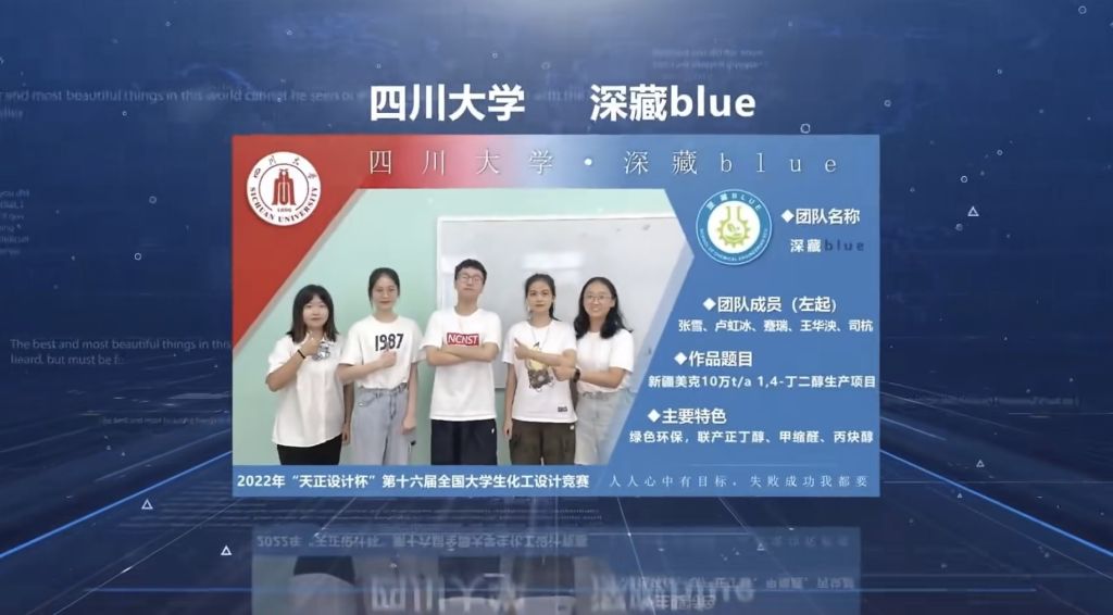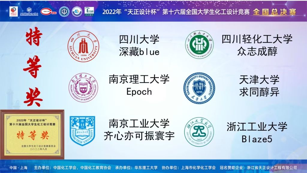 在8月22日结束的2022年“天正设计杯”第十六届全国大学生化工设计竞赛全国总决赛中,四川大学“深藏BLUE”团队从1892支参赛队伍中脱颖而出,斩获全国总决赛特等奖。这是我校2012年以来连续11年获得全国特等奖的殊荣(其中2012,2016获得全国总决赛金奖第一名)。