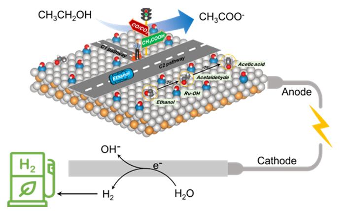 该研究工作采用耦合乙醇的选择性电氧化过程来改善传统电解水系统中阳极缓慢的动力学和降低电解电压。通过简单的自发电位还原过程,制备了单原子Ru修饰的Pt3Ni合金催化剂,电化学测试表明,Ru1-Pt3Ni/NiF在碱性介质中具有良好的稳定性和4倍于商业PtC催化剂的乙醇电氧化活性。研究表明,催化剂中单分散的Ru位点不仅可以促进催化剂表面的电子转移,还能显著降低吸附羟基的吉布斯生成自由能,从而提升乙醇氧化活性和降低氧化反应起始电位;同时Ru的存在引入了大量吸附羟基,促进了乙醇分子的α-脱氢和O-H断裂,削弱乙酸在催化剂上的吸附,实现了乙酸产物的高选择性。通过避免阳极气相产物的生成,可在不使用离子交换膜的条件下制备高纯氢。在构建的Ru1-Pt3Ni/NiF ||Pt3Ni/NiF乙醇电解制氢电池中,单位制氢能耗为19.24 kWh/kgH2,较传统电解水制氢能耗下降50%,制氢法拉第效率达到94%。