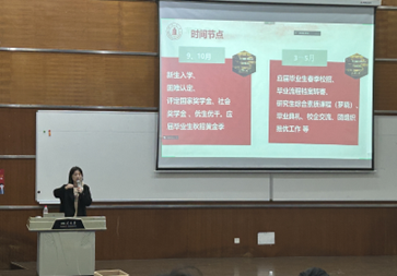 研究生管理情况以及服务学生工作的重要时间节点,使同学们对于辅导员工作、学籍老师工作以及各系办老师的工作有了进一步的了解。同学们深刻意识到,研究生生活的有序进行,离不开辛勤工作的老师。随后,李颖丽老师向大家介绍了学校学生工作相关部门的职能以及其所在位置,如研究生院、党委学生工作部、保卫处、校医院等,给行政事务处理一头雾水的同学们指点了迷津,提高了同学们的问题解决效率并保证了同学们在必要时能够获得相应的帮助。学生工作基本情况介绍完毕后,李颖丽老师向同学们解读了《研究生手册》中的相关国家法律与校级校规,如校外住宿相关条例、学生寝室安全管理规定等内容,并提醒同学们,一定要仔细阅读《研究生手册》,尽量做到熟记,切记勿碰“高压线”。李颖丽老师补充强调了树立防诈骗意识及诚信做人的重要性,希望同学们要保护好自己的人身与财产安全,在诚信问题上“勿以恶小而为之”。最后,李颖丽老师为同学们介绍了一些常用信息获取的网址,并告诫同学们,研究生生活短暂而又宝贵,要抓紧当下,完成好学业、科研任务的同时,去积极参与社会活动与学术活动,多结识年轻的朋友,学习做人、做事的方式方法,希望同学们能够成为有追求、有梦想、具有高尚道德品质的真正的“人”。