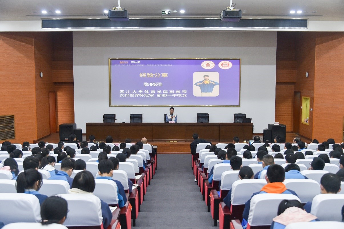 副教授、女排世界杯冠军、新都一中杰出校友张晓雅老师回忆了她在新都一中生活、学习的美好时光,分享了她坚持日复一日刻苦训练、进入女排国家队为祖国荣誉而战、获得世界冠军的成长经历。张晓雅老师以中国女排“顽强拼搏、永不言败”的精神鼓励新都一中的学弟、学妹们要不畏困难、脚踏实地、为梦想努力、为祖国奋斗。同学们都深受鼓舞、倍感振奋。