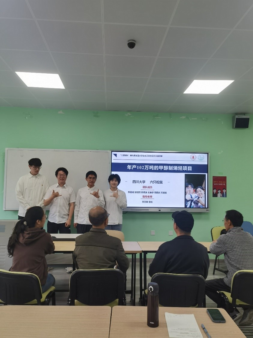 吕松、李万舜、钟月华、陈瑜、李眉眉老师。项目针对目前我国紧缺的化工产品,完成了选址与平面布置、工艺包设计、设备设计与选型、安全设施设计、安全预评价等内容,从本质安全化角度利用专业知识优化工艺路线,工艺参数,提高产品收率,实现低碳绿色工艺。其中,本质安全设计与评价是实现化工过程安全“源头治本”的关键,参赛学生通过本次大赛,对化学反应安全、化工设备安全、化工设备设计、化工过程控制安全、化工储运安全等领域有了较为深入的全面认识。本次参赛学生涵盖了过程装备与控制工程、化学工程与工艺和互联化工等多个专业,由5位指导教师进行针对性全程指导,并邀请校外数名具有丰富工程经验的工程师和设计院专家参与作品指导。