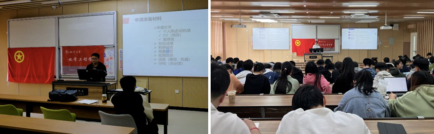 团委和四川大学“定盘星”辅导员工作室联合举办“升学大讲堂”之“留学+考研”经验分享会,于2023年4月7日下午在江安校区综合楼C座105、104教室顺利落下帷幕。本期“升学大讲堂”邀请嘉宾为2019级廖鑫柯、欧盼、唐宗剑、刘会如、佘希硕;此外,2021级辅导员李珍珍老师、付率老师以及近300名本科生参加本次活动。