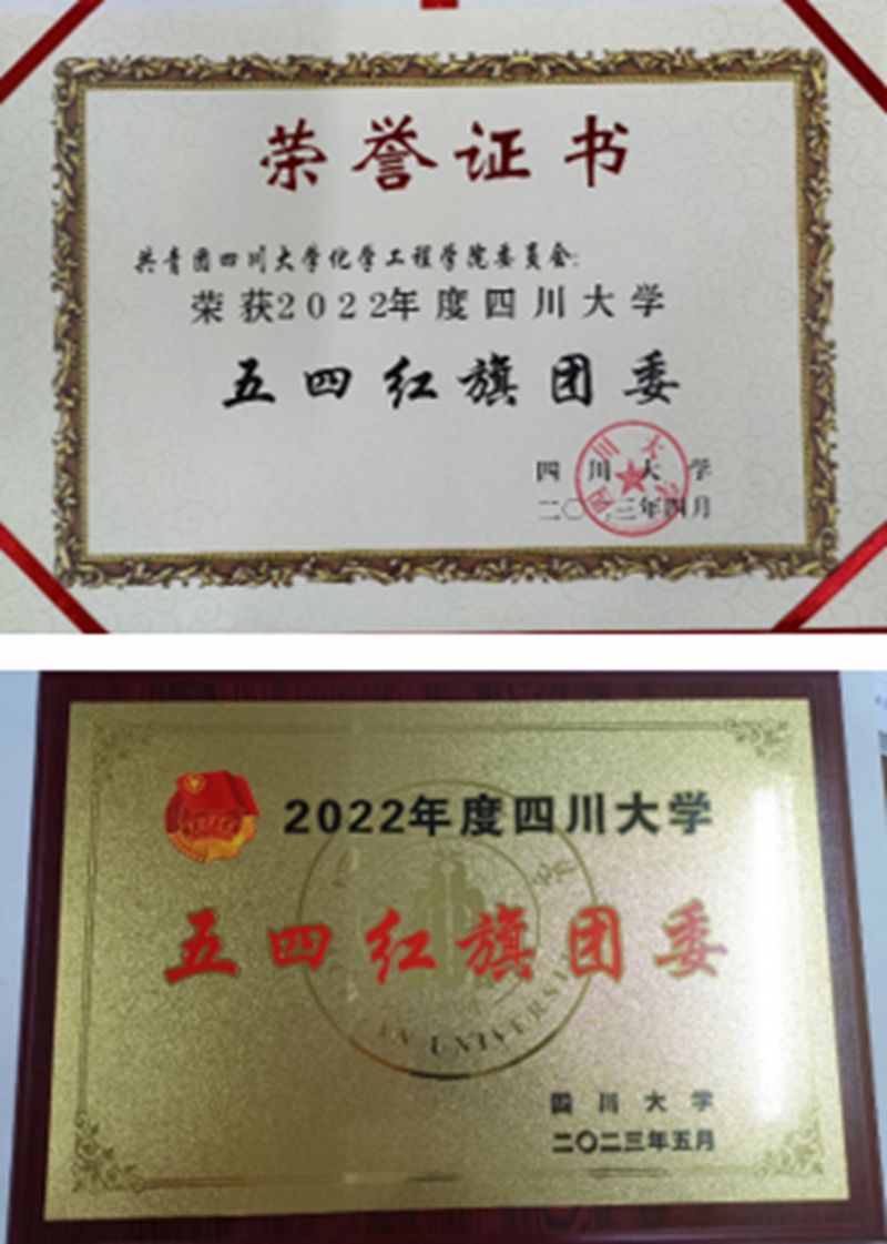 团委荣获“四川大学五四红旗团委”称号,2021级制药工程专业101班团支部获“四川大学五四红旗团支部”称号,团委书记李珍珍获得“四川大学共青团工作标兵个人”称号,研究生王珊珊获得“四川大学青年五四奖章”称号,田向民等10名同学获得“四川大学优秀共青团干部”称号,邱天等23名同学获得“四川大学优秀共青团员”称号。