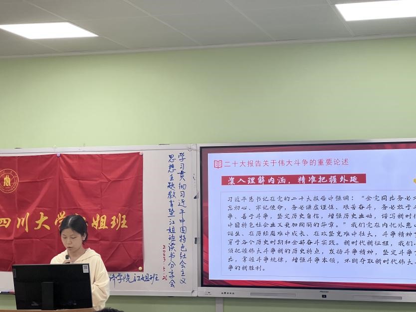读书会由谢洋同学主持开场,并由毕舒欣同学带领江姐班学生进行书籍导读。本次读书会共同研读的书目是《高举中国特色社会主义伟大旗帜 为全面建设社会主义现代化国家而团结奋斗——在中国共产党第二十次全国代表大会上的报告》。