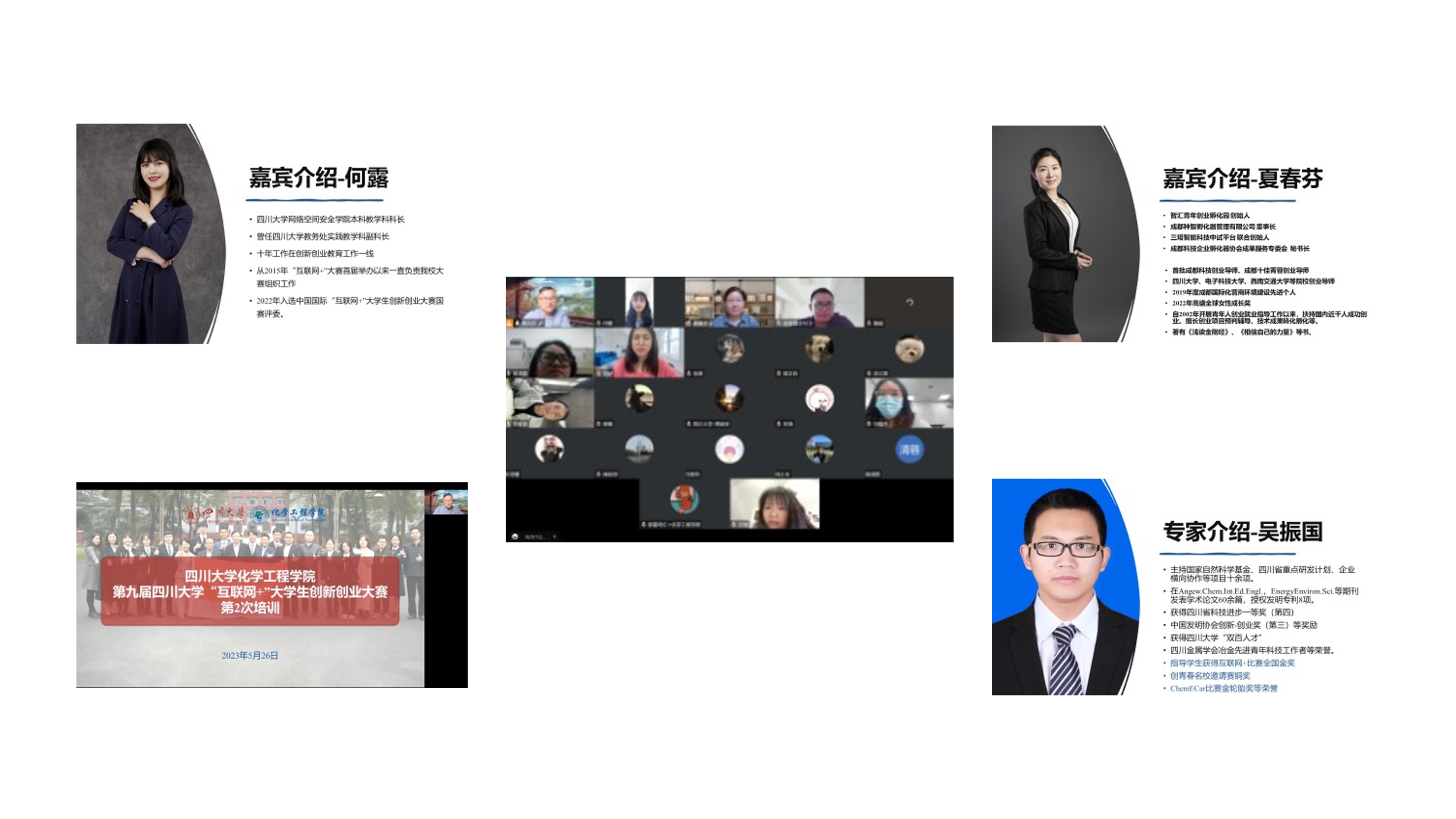 第九届“互联网+”大学生创新创业大赛第2轮培训顺利举行。培训采用腾讯会议线上的方式进行,共计7个项目近30余名师生参与,本次培训共邀请了3位专家对项目进行指导,分别是首批成都科技创业导师、成都十佳菁蓉创业导师、成都种智孵化器管理有限公司夏春芬董事长,具有近10年组织比赛经验的中国国际“互联网+”大学生创新创业大赛国赛评委何露老师,互联网+比赛全国金奖指导教师吴振国副教授。3位专家从对项目的内涵、成熟度、竞品策略、教育维度等方面进行了细致的现场指导和后续交流,鼓励各组从面向国家重大需求、解决民生问题,促进科教转化,服务地方经济发展等方面进一步提升,做好“互联网+”大学生创新创业大赛的备赛。