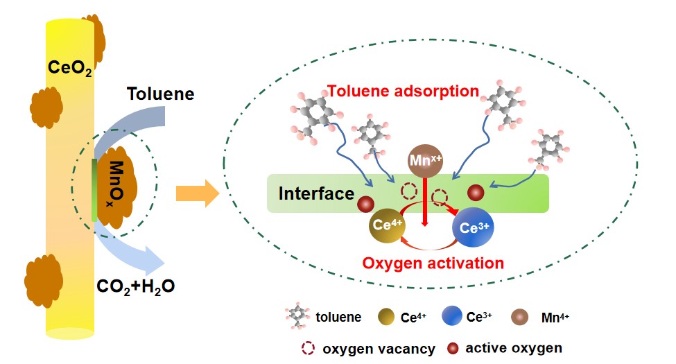 针对多重技术难点,四川大学唐文翔特聘研究员、唐盛伟教授团队提出构建高效非贵金属氧化物异质界面结构的强化策略,采用简单的湿化学浸渍在纳米CeO2表面进行MnOx纳米颗粒的修饰,从而构建与MnOx的异质界面结构。结果表明:异质界面缺陷及其所造成的不饱和环境(如Ce3+)有助于形成活性氧,而且MnOx的加入能降低Ce-O键的强度,促进Ce4+与Ce3+之间的转化,利于氧的活化与迁移。与没有协同作用的CeO2、负载型的MnOx-SiO2以及物理混合型的MnOx+CeO2相比,新型MnOx-CeO2异质结构催化剂对低浓度甲苯分子吸附能力会得到明显加强。相关成果 “Low-Temperature Oxidation of Toluene over MnOx-CeO2Nanorod Composites with High Sinter Resistance: Dual Effect of Synergistic Interaction on Hydrocarbon Adsorption and Oxygen Activation”发表于Inorganic Chemistry (doi.org/10.1021/acs.inorgchem.2c02738)。