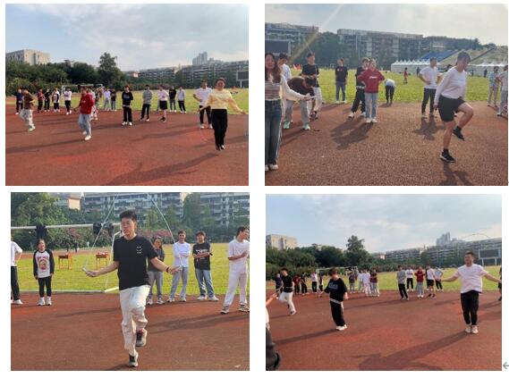接下来是跳绳接力赛,每组四个队员依次跳绳50下,最后记录总用时。在阳光的照耀下,成员们轻盈的身姿展现在塑胶操场上。现场一片青春气息,平日里为科研和实验所累的研究生们在此刻纵享运动带来的快乐,挥汗如雨。