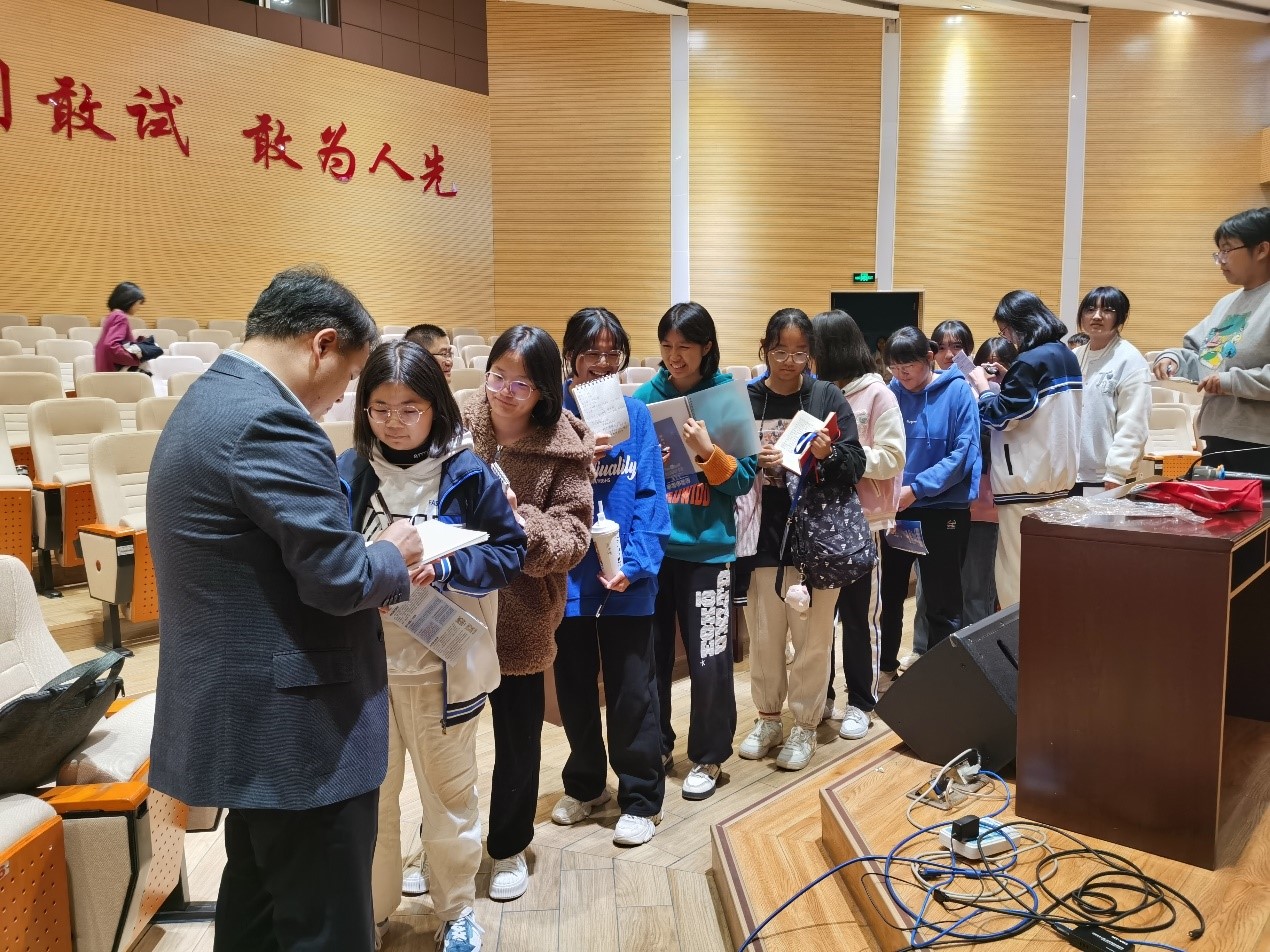 求学、一路奋斗、留校工作并成为国家级重要人才的成功经历。他鼓励同学们一定要始终保持对未知事物的好奇,自信乐观、不畏困难、勇于创新。在场同学们都深受鼓舞、倍感振奋,在讲座结束后排起了长长的队伍,请郭教授签名。郭教授认真的为每一位学弟学妹写下了鼓励、祝福的话语,签下了自己的名字。