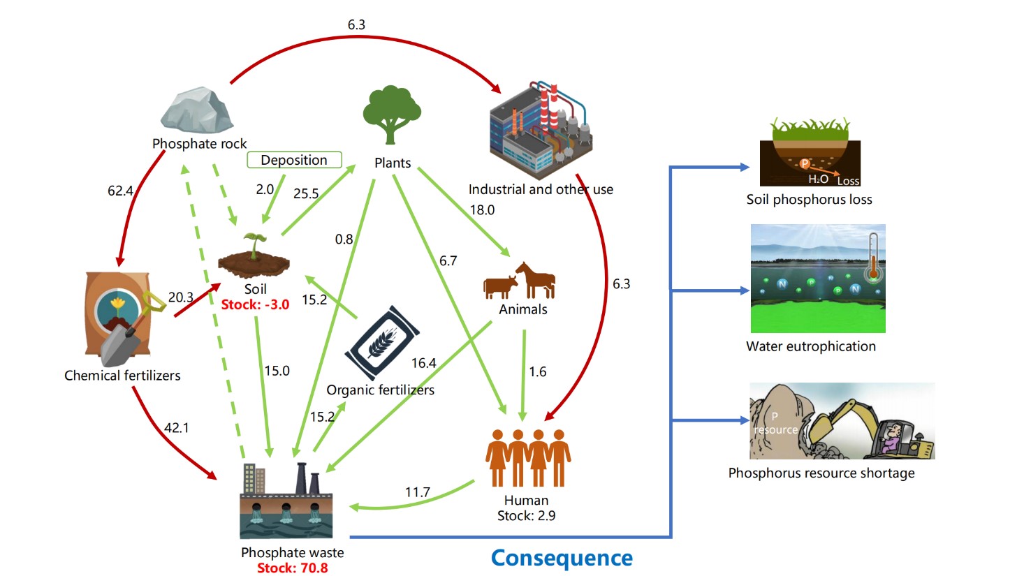 图1简化的现代社会磷循环图。绿线代表自然磷流向;红线代表人类活动扩大的磷流向;蓝线代表磷资源流失的后果。