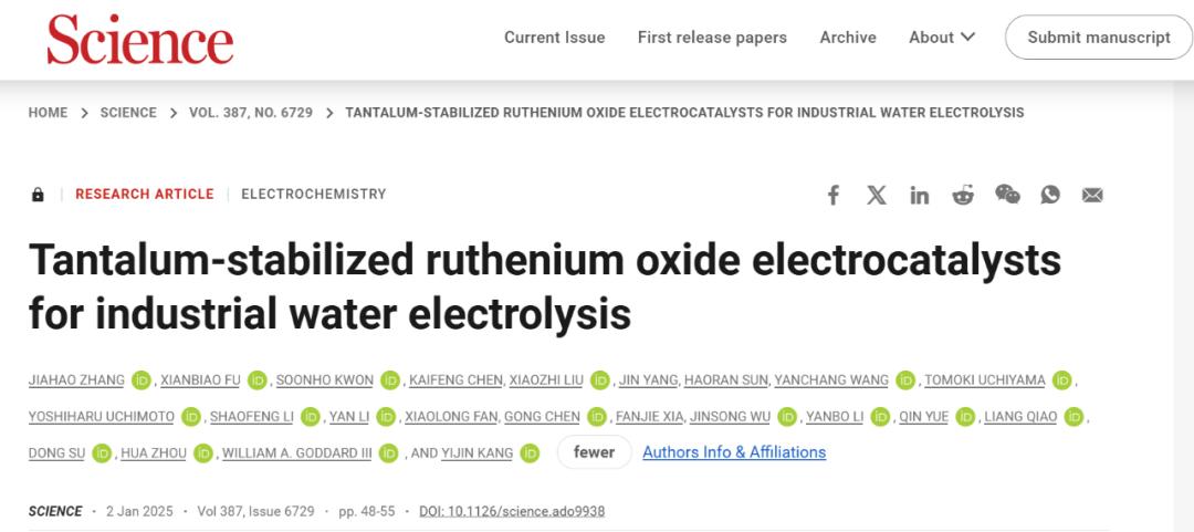 William A. Goddard教授团队在《Science》发表了题为“Tantalum-stabilized ruthenium oxide electrocatalystsfor industrial water electrolysis”的文章。8bo足球即时比分-足球比分app