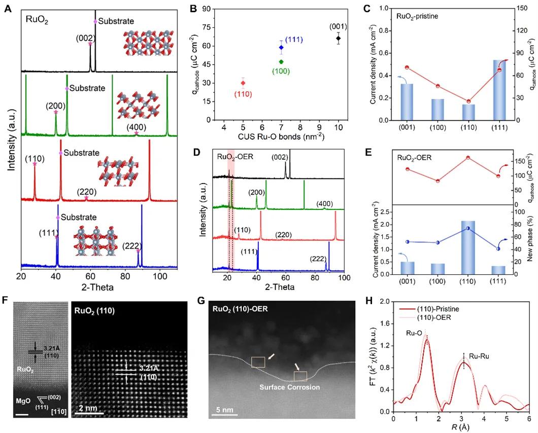 Ru基氧化物因优异的析氧活性被视为另一类潜在的PEM电解水阳极催化剂,然而其稳定性相较于Ir基催化剂表现出明显劣势。理解RuO2结构失效机制为指导设计高稳定性RuO2催化剂提供了底层逻辑。当前针对Ru基氧化物的稳定性优化策略已被广泛报导,但围绕RuO2的结构失效机制仍未明晰,且常用的纳米颗粒催化体系中复杂的表面结构和晶面组成给原子层面研究催化剂失效机制带来了巨大挑战。
