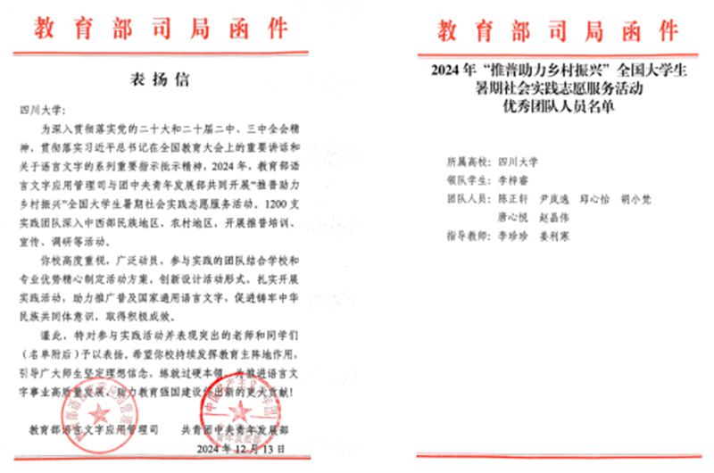 重点团队“青系昭觉·彝路生花”志愿服务队荣获“优秀团队”称号。教育部语言文字应用管理司、共青团中央青年发展部给四川大学发来表扬信。