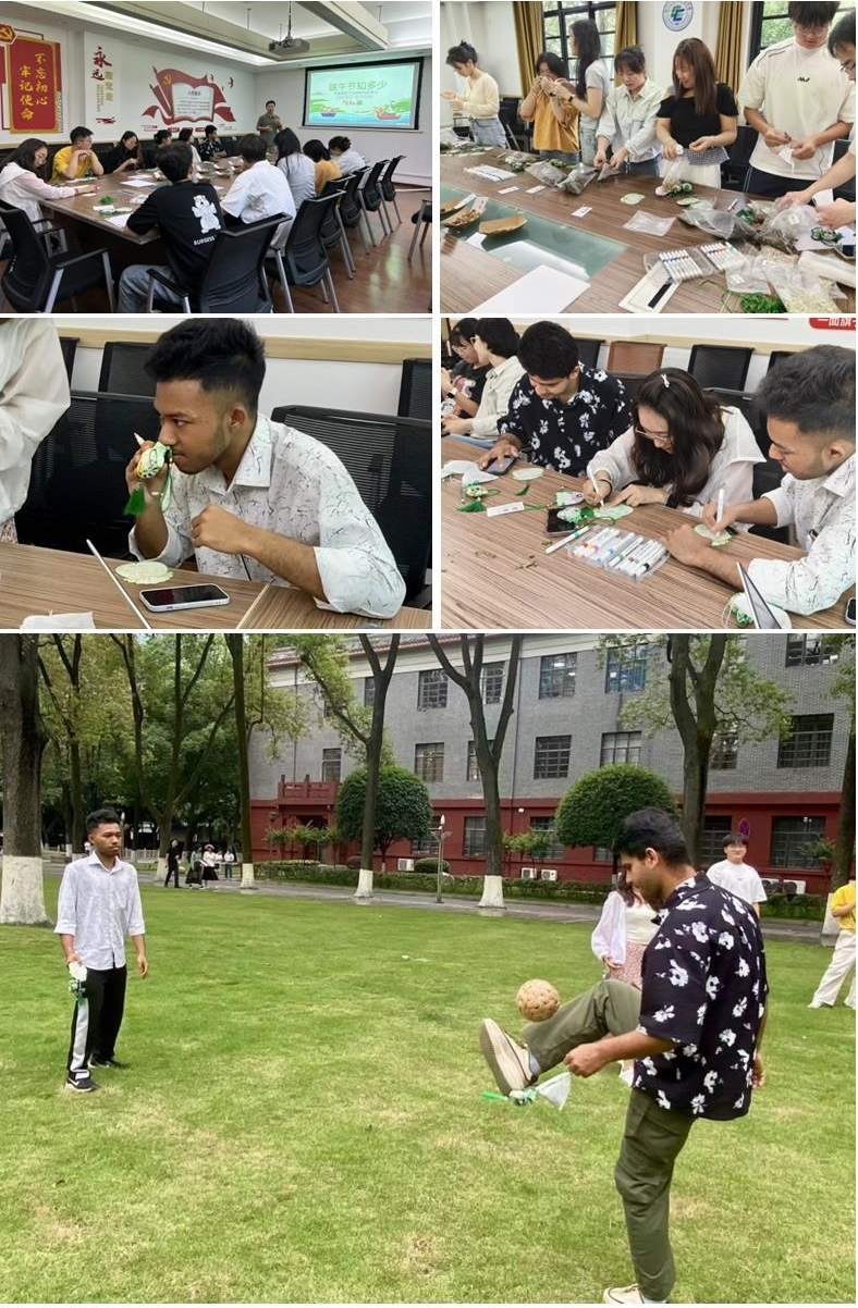 活动伊始,辅导员邓磊详细介绍了端午节的传统文化、节气文化和传统体育文化。之后在邓老师的引导下,同学们亲手制作香囊。在香囊上绘制精美图案,填充艾草等香料,体验传统草药所带来的驱蚊、提神等效果。随后,同学们在端午卡片上认真写下对彼此的祝福,或幽默风趣,或深情厚意,承载着满满的关怀。最后,同学们体验了传统体育蹴鞠,感受传统体育项目的魅力。