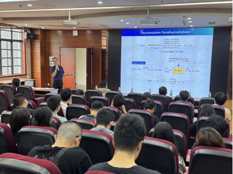教授们的报告,激发了同学们对于绿色低碳、人工智能和生物医药的浓厚兴趣,同学们积极思考,踊跃提问,现场交流氛围良好,同学们纷纷表示收获颇丰、受益匪浅。报告结束后,同学们参观了膜科学与功能材料实验室。香港中文大学带队老师Gavin Chit Tsui(徐哲)教授为川大师生作了题为“Access to novel fluorinated motifs via transition metal-catalyzed defluorinative functionalization strategy”的学术报告。徐老师系统介绍了研究团队在氟化学、过渡金属催化反应、有机催化、不对称合成和催化剂设计等方面的研究工作,并与川大老师和同学们进行了学术交流。