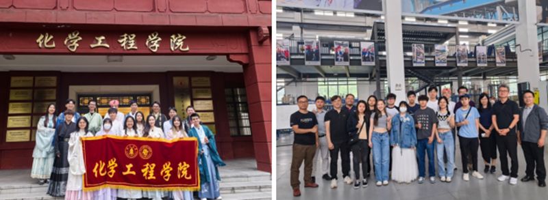 制药工程协会举办的“古代颜芳,今世名妆”传统文化体验活动。同学们身着汉服,共同完成了胭脂的制作,不仅体验了中国传统文化,也增进了中大学子与川大学子之间的感情。此外,香港中文大学师生参观了四川大学卓越工程师训练中心。同学们在卓工中心王袁隆老师的带领下进入到卓工中心,同学们就被高大的车间和整齐排列的“大”设备所震惊,这些都是他们平时在实验室没办法接触到的仪器设备。参观当天刚好遇到化学工程与工艺专业的本科生开展乙醇溶液的精馏实验,香港中文大学的师生与川大学子就实验进行了深入交流,体会到了化学与化工的不同,感受到了化工的神奇之处。此外,同学们也参观了四川大学互联化工研究中心,听老师讲解了化工+AI的故事,感受智能制造和万物互联的强大生产力。