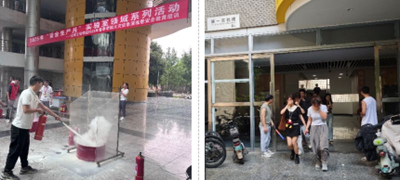 安全专家刘长军、王袁隆及罗王春等讲解手提式灭火器、灭火毯等常用消防器具的基本使用方法,之后参训师生对模拟火焰实施灭火实操。随后,模拟实验楼B座突发火情,根据预设的逃生线路实施全楼人员疏散的应急演练。