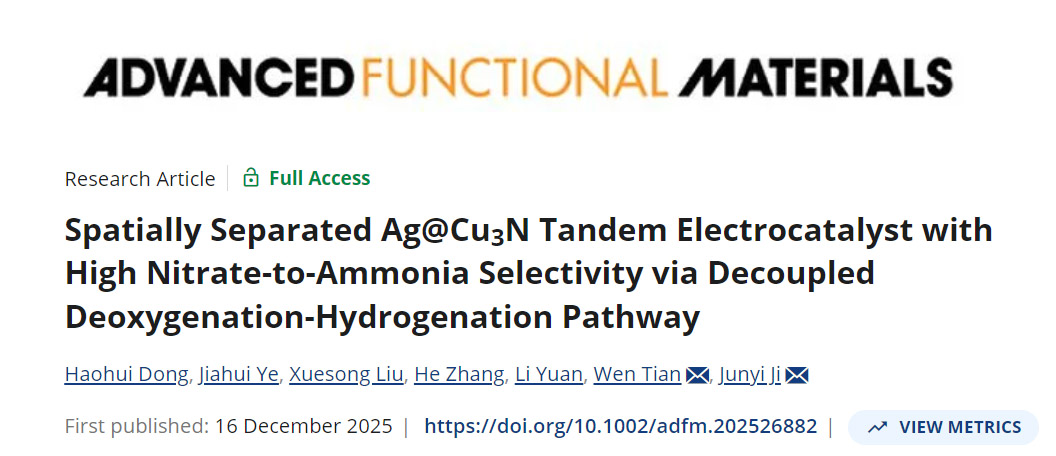 吉俊懿教授团队在《Advanced Functional Materials》期刊发表了关于硝酸根还原高性能串联电催化剂设计的研究论文“Spatially Separated Ag@Cu3N Tandem Electrocatalyst with High Nitrate-to-Ammonia Selectivity via Decoupled Deoxygenation-Hydrogenation Pathway”。硕士研究生董浩辉为论文第一作者,吉俊懿教授和田文高级实验师为论文共同通讯作者,我校为论文唯一通讯单位。