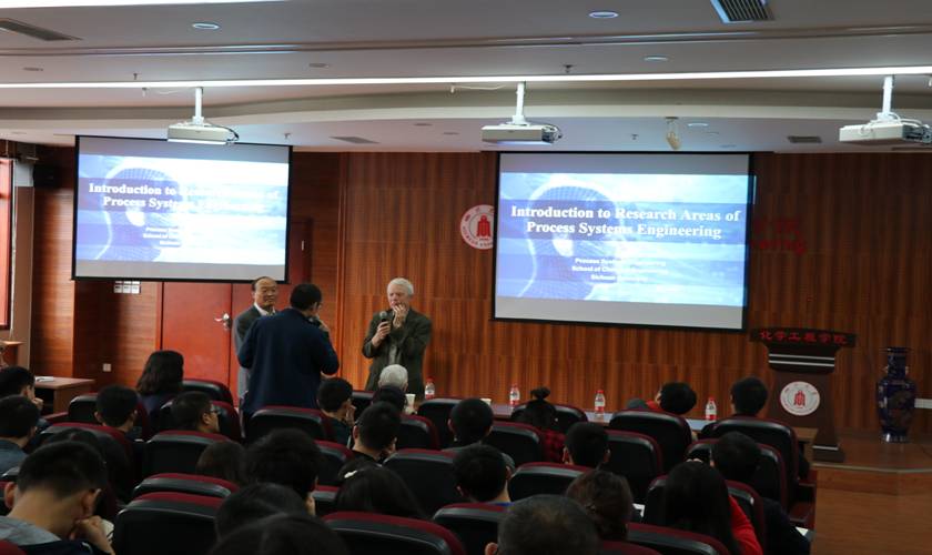 接着,Arthur W. Westerberg教授概括性地讲述了他近60年来的研究经验和成果。从计算机的进步到计算机算法和方程的逐渐成熟,Arthur W. Westerberg教授以列举问题的形式逐一展开了他和他的学生这么多年来的研究成果,并在汇报最后以幽默诙谐的风格对他所创建的工程设计研究中心进行了简单的介绍。随后的提问环节中,同学们都对Arthur W. Westerberg教授所讲授的内容表示出浓厚的兴趣,纷纷积极踊跃地针对教授所讲内容进行了提问。