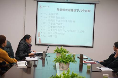 本科教学还在多方面开展了相关质量控制调研工作,在会上,教务办公室章鹏老师就“学生评教结果统计分析及措施”,杨婕老师就“毕业生满意度调查结果统计分析”,班主任助教张川同学和张莉萍同学就“班主任助教工作汇报及经验交流”分别进行了发言。