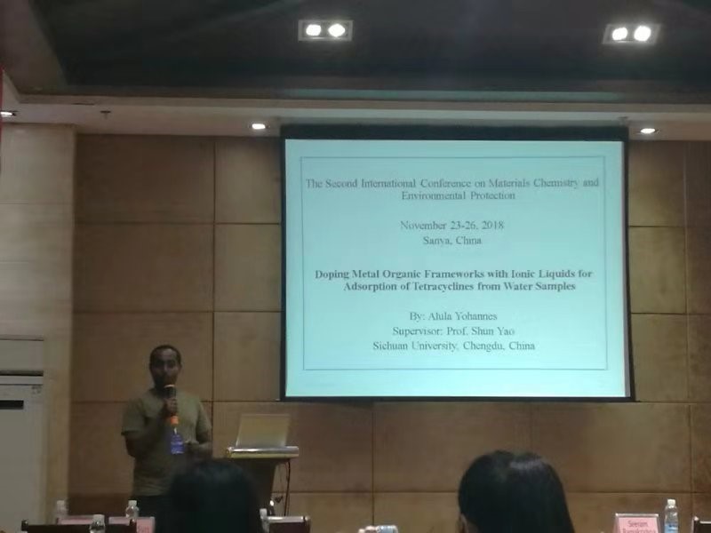 培养的第一位留学生。现主要从事新型多功能材料的设计、开发及其在制药分离工程和环境工程中的应用基础研究,2017年1月在马来西亚首都吉隆坡举行的第三届离子液体分离纯化会议(3rdInternational Conference on Ionic Liquids in Separation and Purification Technology,Elsevier出版集团主办,本领域国际核心会议)上亦受邀作过关于“Extraction of bioactive ginseng saponins using aqueous two-phase systems of ionic liquids and salts”的专题报告,收到各国与会者关注与肯定。在过去的两年多时间里,N. Alula Yohannes博士努力克服语言障碍学习各门研究生课程,致力于科学研究的同时也推动了中非、中埃文化及教育交流,受到了四川大学国际合作与交流处以及埃塞俄比亚驻华领事的肯定;此外还担任了制药工程专业实验的助教及大学生创新创业活动的指导工作,深受师生们的喜爱。