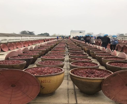上午十点半,参观队伍到达了鹃城牌豆瓣公司。本次实习由鹃城讲解员带领大家参观学习。经讲解员的介绍,同学们了解到了公司的发展历史与豆瓣酱的发酵制作工艺。从辣椒的腌制,豆瓣的处理以及两者混合后的晾晒发酵都有了更为深刻的认识,结合微生物学与发酵工程课上学到的知识,同学们对自己的专业和理论知识都有了更深的认识。