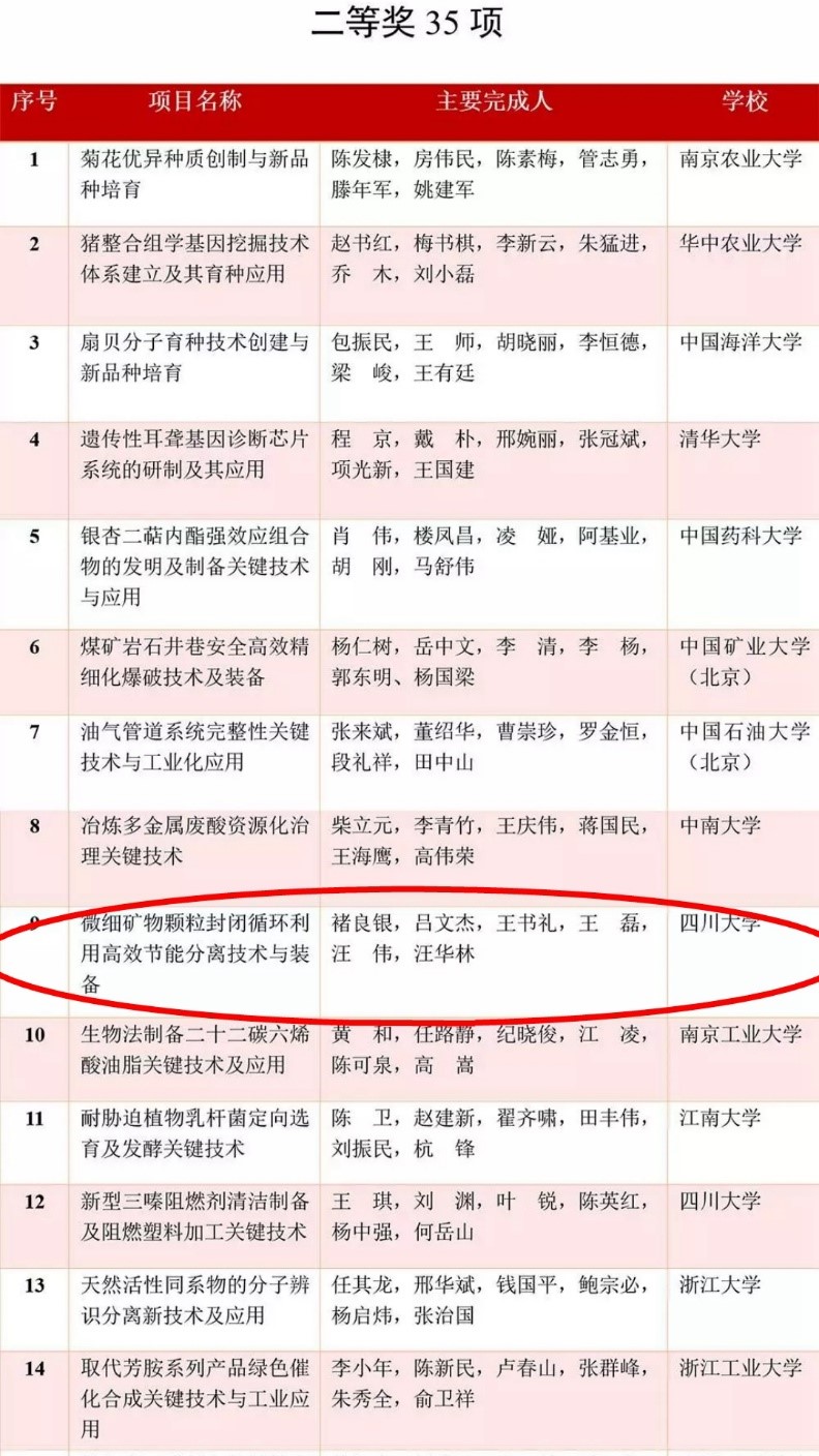 褚良银教授团队牵头完成的“微细矿物颗粒封闭循环利用高效节能分离技术与装备”项目喜获“国家技术发明二等奖”。让我们为褚良银教授团队表示祝贺!