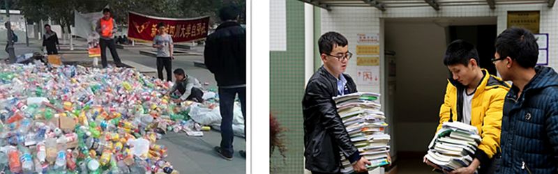 图十九:收集到的塑料瓶 图二十:志愿者搬运收集到的废旧书籍