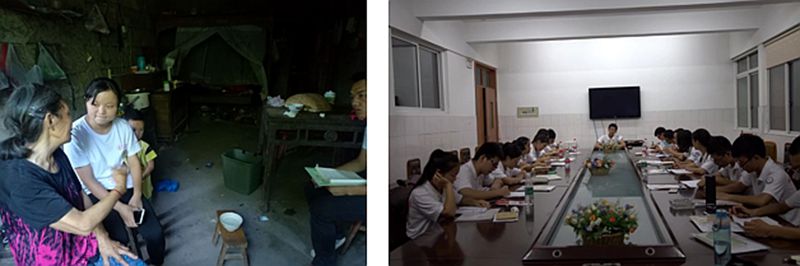 图九:队员在与学生奶奶交谈并记录 图十:在乐山峨眉七中组织大家开会