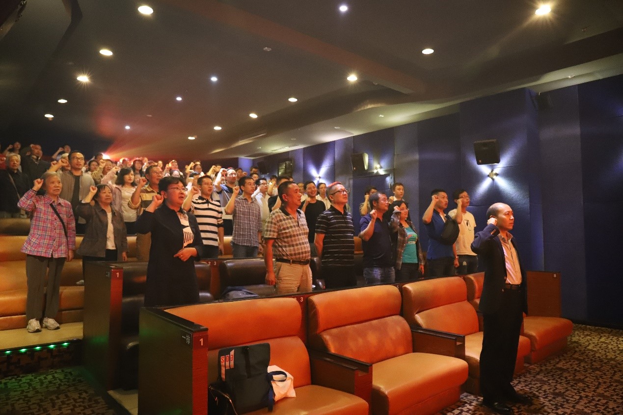 党委副书记、纪委书记李天友同志的带领下面向党旗重温入党誓词。“我志愿加入中国共产党……”,面对鲜红的党旗,同志们高举右拳,字字铿锵,重温入党誓词,响彻在每一个影厅,让“忠诚、干净、担当”真正入脑入心。在重温誓词的时候,每一个党员都在回头看看自己入党之后走过的“路”,找出其中的不足,不忘初心、牢记使命,抬起头来向优秀的党员学习,争做合格的共产党员。