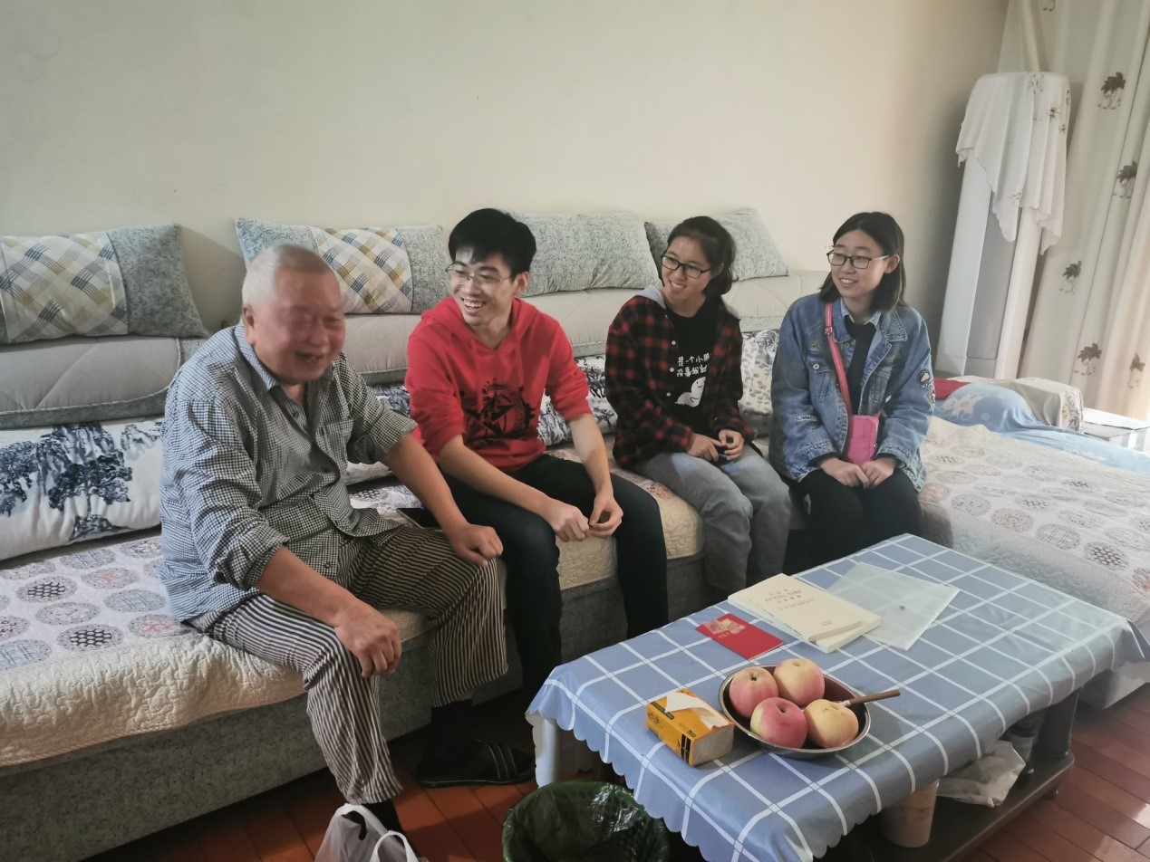 余华瑞老师今年已87岁高龄了,但志气旺盛精神矍铄不失风采。余老师慈眉善目和学生志愿者们聊的很开心,向学生志愿者们解答了很多大学生学习方面的困惑并提出了期望,希望大家认真学习报效祖国。