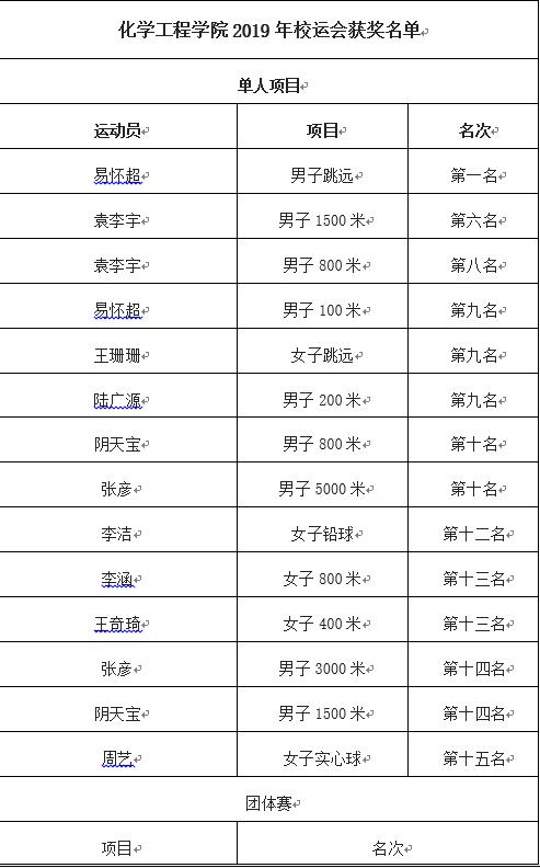 对于本次运动会,化工健儿们踊跃报名。比赛前,运动员们刻苦训练;比赛时,他们奋勇争先,顽强拼搏,取得了优秀的成绩。在单人项目中,运动员们在男子跳远、男子800米、男子1500米和女子跳远等项目均取得了优秀的成绩,其中男子跳远更是取得全校第一名的好成绩。在集体项目中也充分体现了团结协作精神,在男子4*100、女子异程接力等项目中有不错的表现。