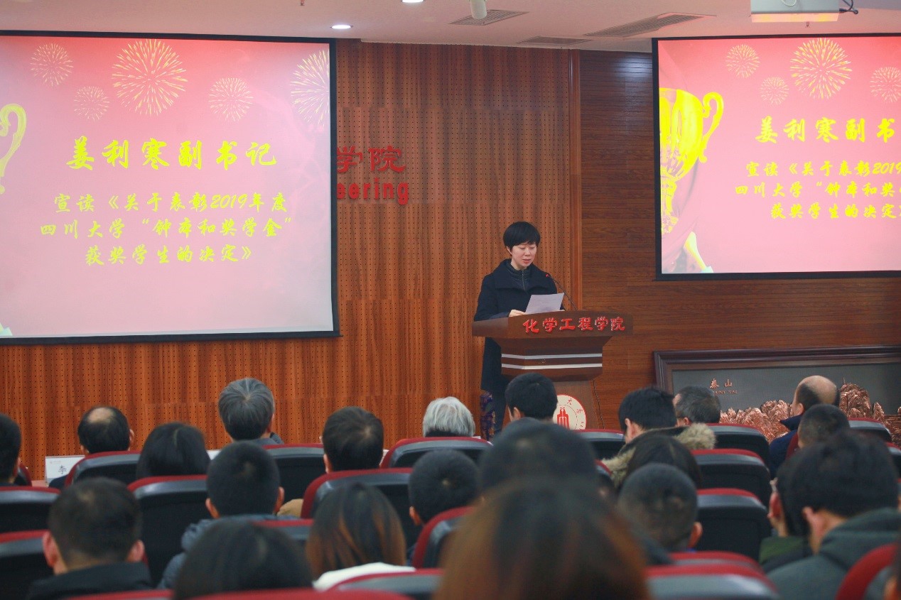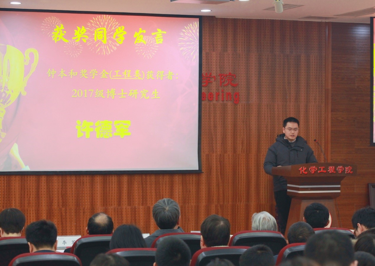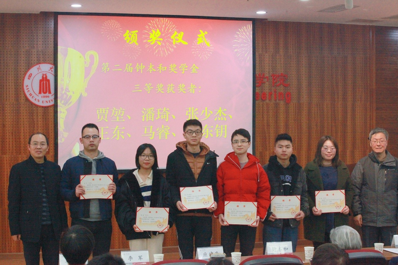 向几十年如一日,孜孜不倦支持学校发展的钟本和先生致以崇高的敬意,对钟先生及其领导的磷化工团队为国家和社会所做出的重要贡献给予高度肯定和赞扬,向受表彰同学表示热烈祝贺。同时,他对获奖同学提出了殷切希望:希望同学们能够倍加珍惜这份荣誉,传承和发扬磷化工老一辈科学家锐意进取、爱国奉献、刻苦钻研的精神,落实“立足基础、面向工业、服务社会”的理念,将来用真才实干报效国家,服务社会。姜利寒副书记宣读了《关于表彰2019年四川大学“钟本和奖学金”获奖学生的决定》。在老师和同学们热烈的掌声中,赵院长、李书记、唐院长、姜书记等与会领导和磷化工团队应建康、李军教授分别登台为10位获奖学生颁发奖状,并合影留念。2017级博士研究生许德军代表荣获第二届“钟本和奖学金”获奖学生发表获奖感言。