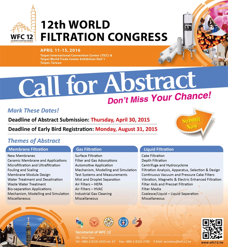 “第十二届世界过滤大会(12th World Filtration Congress (WFC12))”将于2016年4月11-15日在台北举行。该会议是国际上分离领域最重要的大规模定期学术会议。现在大会开始公开征集论文,论文摘要截止时间是2015年4月30日。详情点击//www.wfc12.tw/submissions.html 请感兴趣的师生报名参加。