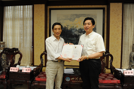 会上,谢和平校长代表学校向姜维平校友颁发了四川大学客座教授证书。四川大学教育基金会秘书长荣建国和重庆圣华曦药业股份有限公司董事长姜维平代表双方在四川大学化学工程训练中心捐赠协议上签字。