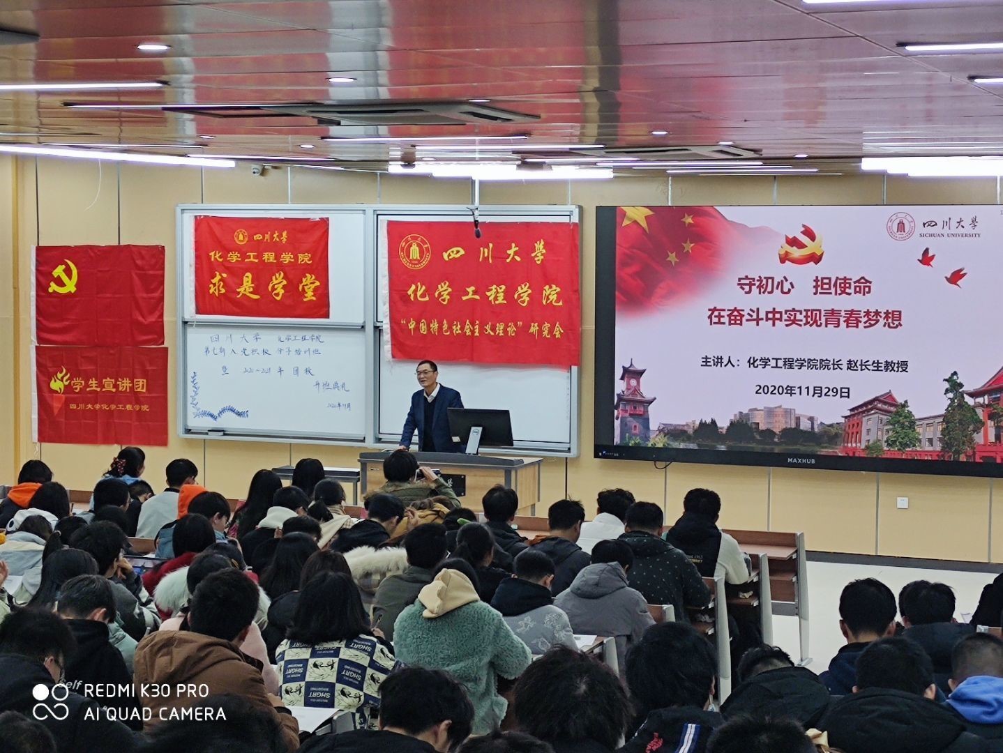 在第一章节中,赵院长阐述了初心使命的内涵,提到“初心使命是不忘恩、初心使命是不忘本、初心使命是不忘质,践行初心使命永远在路上”。然后在第二章节中重点对“树立远大理想,勇于砥砺奋斗”的内容进行的详细的说明,他提到,“远大理想体现在历经磨难、不改初心的坚守中,特别是以“江姐”(江竹筠)为代表的四川大学师生在抗日战争时期可歌可泣的壮丽伟歌;远大理想体现在学以报国、无私奉献的践行中,尤其是以“中国塑料之父”徐僖院士、张洪沅先生的典型事迹是最好的诠释;远大理想还体现在勇立潮头、为国为民的担当中,其中既有四川大学涌现的张澜、吴玉章、王右木、杨闇公、童庸生、朱德等前辈的艰苦奋斗,又有钟南山、张定宇、陈薇、张伯礼等前辈的踏实躬行,更有90后、00后年轻人等同辈的勇担使命……”最后,在第三章节中赵院长一直在强调“习近平总书记一直关心挂念着广大青年,十分重视青年工作,对新时代的青年寄予深切厚望和殷切期盼,青年一代有理想,有本领,有担当,国家就有未来,民族就有希望”。