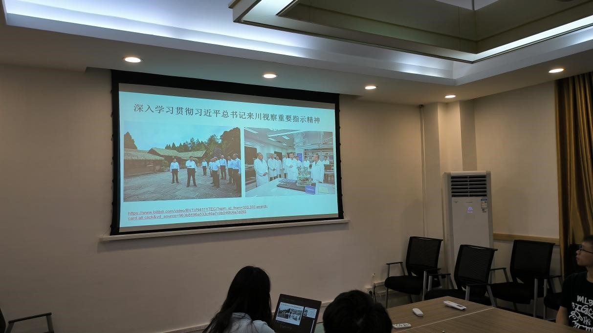学习会第一项,全体参会同志集中观看习近平总书记来川视察新闻报道视频。邱可佳同志表示,习近平总书记考察了翠云廊古蜀道、三星堆博物馆等具有重要意义的文化历史地标,了解了当地推进历史文化传承、加强生态文明建设和历史文化遗址发掘研究、文物保护修复等情况。作为四川大学的青年学生党员,我们每一位同志都应当学习和了解四川省的历史和文化,紧跟习近平总书记的步伐,将学习蜀文化融入日常的科研生活中,既能提升个人的文化素养,又能在精神层面贯彻落实总书记对青年一代的期望和嘱托。