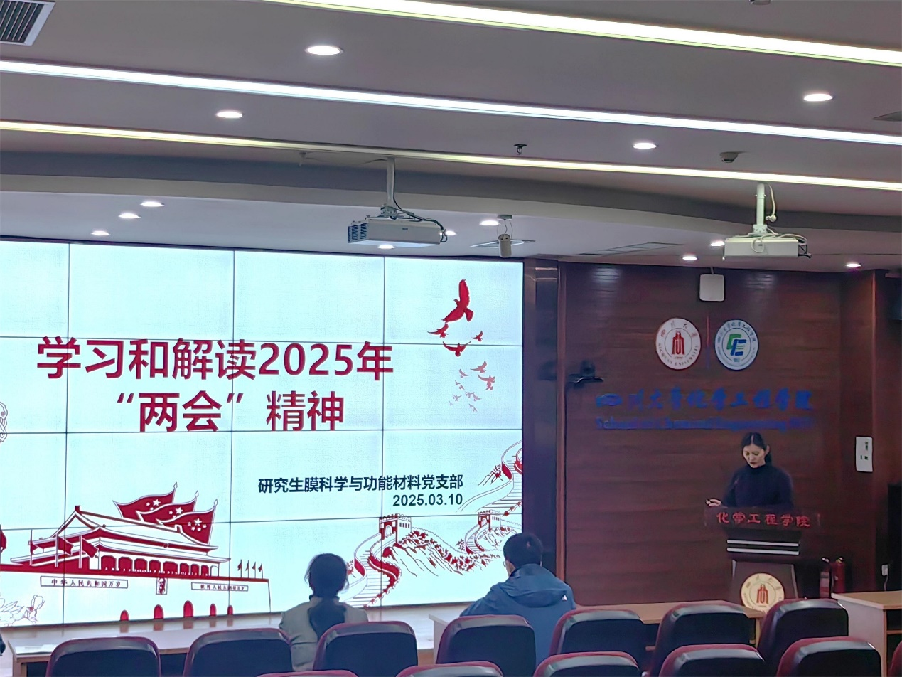 2025年3月4日、5日,全国政协十四届三次会议、十四届全国人大三次会议在北京召开。习近平总书记在参加江苏代表团审议时强调,今年是“十四五”规划的收官之年,要牢牢把握高质量发展这个首要任务。为深入学习贯彻全国两会精神,提升支部党员同志的思想政治素养,同时结合我支部“膜”范同行工程品牌推动研究生事务管理高质量发展,丰拓党建品牌内涵,膜科学与功能材料党支部于2025年3月11日晚在望江化工楼313室开展学习全国两会精神暨 “膜”范同行工程助力研究生事务优化提升组织生活。本次活动特别邀请8bo足球即时比分 副院长谢锐教授、化学工程系党支部书记汪伟教授共同参与。