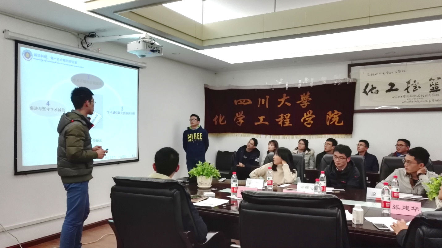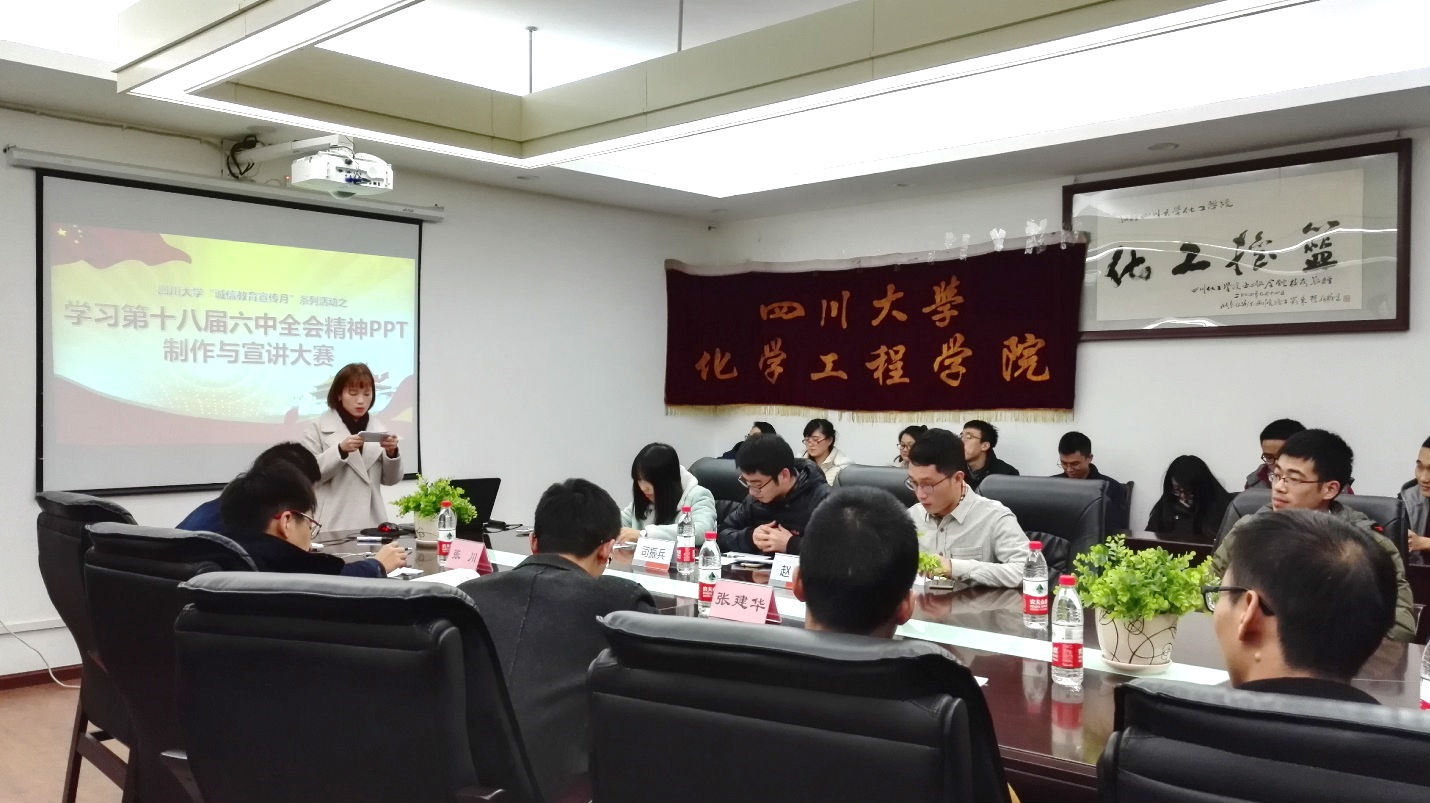 2016年11月23日19点,四川大学“诚信教育宣传月”系列活动之学习第十八届六中全会精神PPT制作与宣讲大赛在化工楼235顺利举行,本次活动由8bo足球即时比分 研究生分会主办。参加这次PPT大赛的全部为来自8bo足球即时比分 的全部14个研究生党支部。8bo足球即时比分 思政辅导员司振兵老师、8bo足球即时比分 党政办公室高敏老师、8bo足球即时比分 兼职辅导员赵磊学长、8bo足球即时比分 研究生会主席张川、奚月恒、张建华学长出席了本次活动,并担任评委嘉宾。活动由2016级应化专业研究生徐双凤主持。