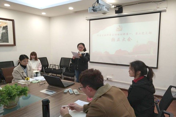研究生膜科学与功能材料第一党支部在化工楼227会议室隆重举行了2018年秋季预备党员转正大会,对谭昕玥、蒲兴群两位同志的转正问题进行了讨论。会议由党支部书记徐敏航主持,第一党支部全体党员参加了此次会议。