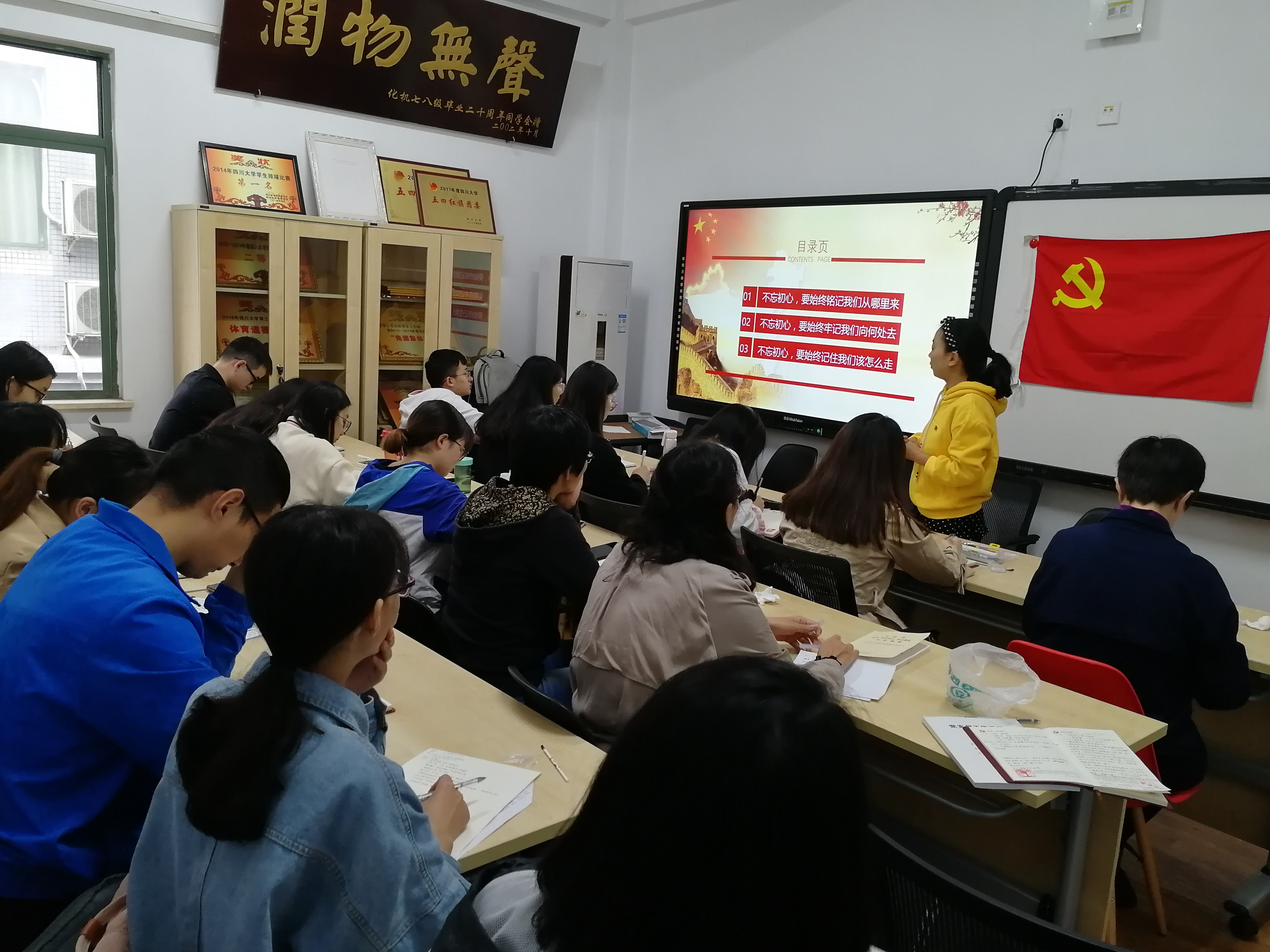 本科社区党支部书记李珍珍老师从“从哪里来,向何处去,该怎么走”三个方面告诉大家,新时代我们怎么才能做到不忘初心。首先,不忘初心,要始终牢记我们从马克思主义中国化的实践中走来,从最广大的人民群众中走来,从中华文明的传承中走来。中国共产党在90多年风云激荡中坚定马克思主义政治信仰,在实践发展中开辟马克思主义新的境界,引领我们从胜利不断走向新的胜利。从50多名成员发展到有9000多万成员的大党,群众的信任,鼓励我们不断前行,把一个在风雨飘摇、饱受欺凌的东方古国正带向辉煌灿烂的未来。其次,不忘初心,要始终牢记我们向着实现共产主义远大理想的目标去,向着实现中华民族伟大复兴中国梦的目标去,向着实现人民对美好生活的向往的目标去。民心顺则国家顺,民怨除则国家兴,在我们这样有着14亿人口的大国,各种民意交错,各种民怨并存,党的领导干部要善做“排气筒”和“润滑剂”,用心去顺民意、化民怨。最后,不忘初心,要始终谨记我们要走绝对忠诚的光明之道,走敢于担当的有为之道,走廉洁自律的干净之道。“吾日三省吾身”是检讨自己的实招,也是提升境界的良方。作为共产党员,我们更应该带头把纪律和规矩挺在前面,模范遵守党章党规、时时严要求、处处留戒心,始终保持“泾溪石险人兢慎”的状态。