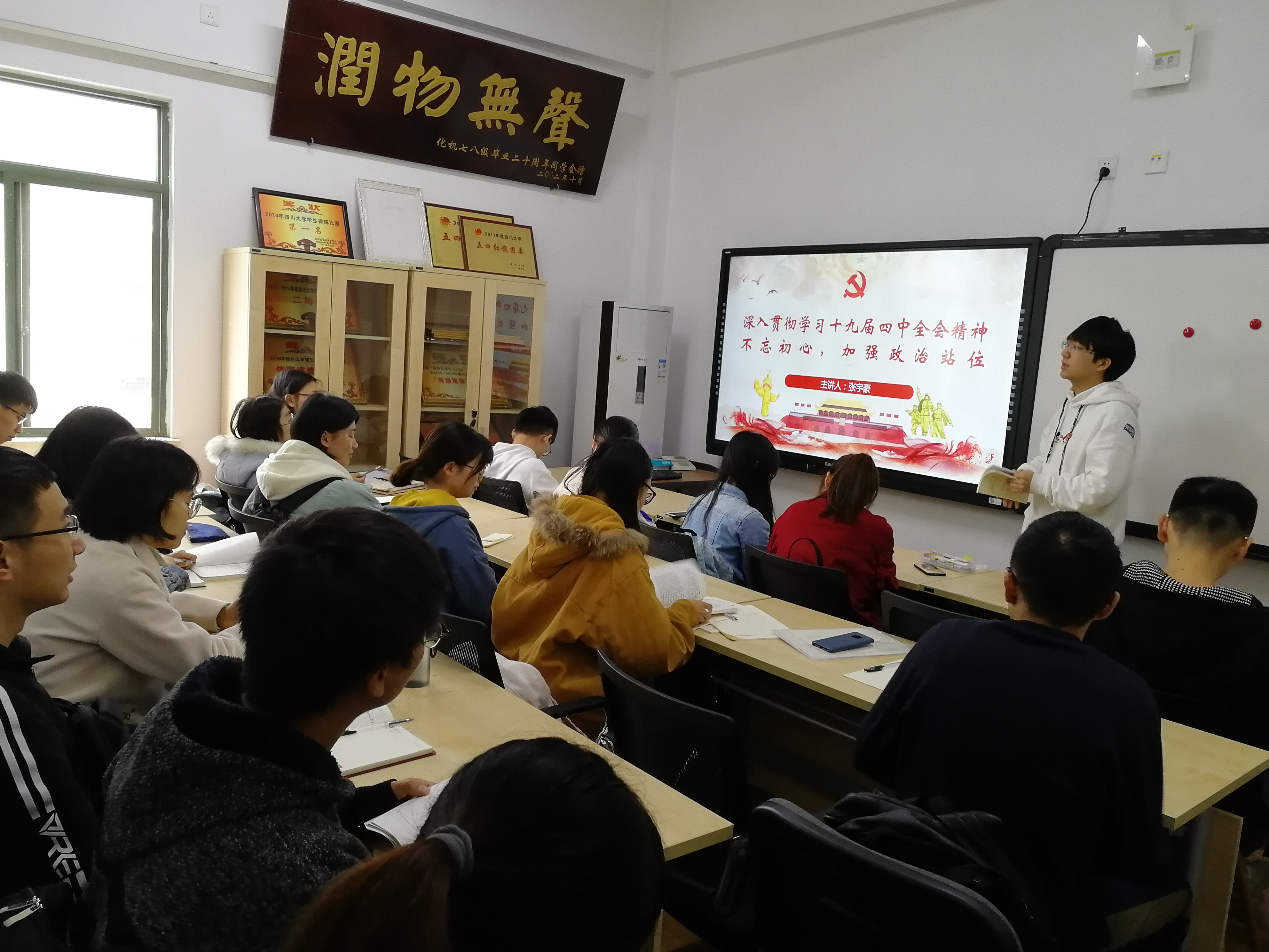 本次党组织生活的内容是学习探讨《习近平关于“不忘初心,牢记使命”论述摘编》的四五六章节。首先,支部同志以十九届四中全会精神为切入点,共同学习其核心精神,要增强“四个意识”,坚定“四个自信”,做到“两个维护”,坚持和完善中国特色社会主义制度,推进国家治理体系和治理能力现代化,坚持党的领导,加强政治站位。张宇豪同志提到,虽然我们支部成员目前还是在读大学生,但加深和强化政治意识、大局意识、核心意识、看齐意识刻不容缓。支部同志必须在日常生活中坚决维护习近平总书记党中央的核心、全党的核心地位,坚决维护党中央权威和集中统一领导,在任何时候任何情况下都必须在思想上政治上行动上同党中央保持高度一致。